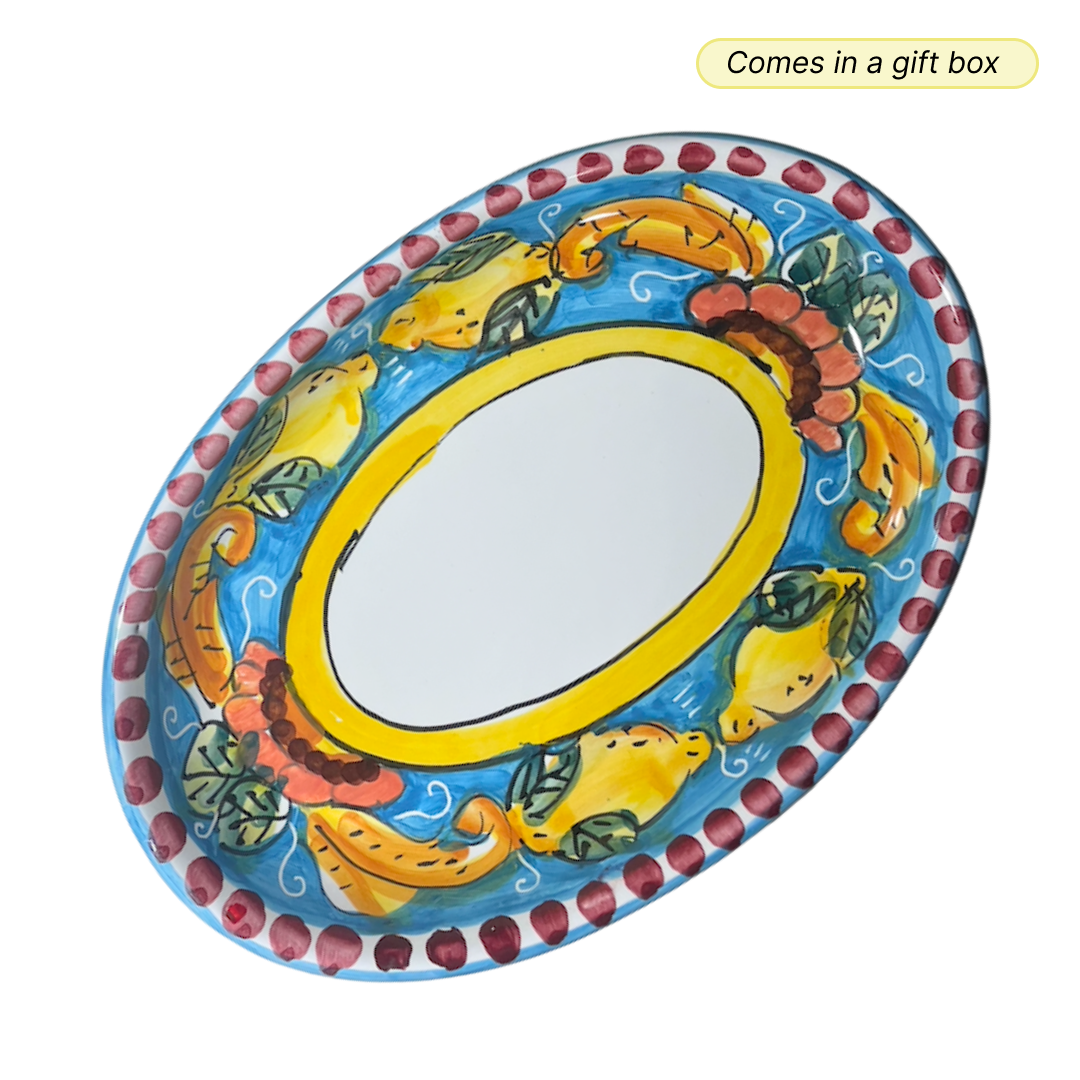 The Oval Serving Platter captures the essence of Italian hospitality. Hand-painted in Vietri, its elongated form is perfect for presenting Mediterranean feasts. The lemon and garden motifs flow across its surface like a fresco, celebrating the joy of sharing meals with loved ones.