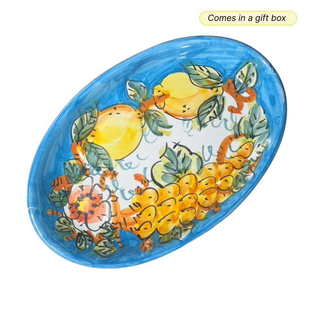 The Oval Serving Platter captures the essence of Italian hospitality. Hand-painted in Vietri, its elongated form is perfect for presenting Mediterranean feasts. The lemon and garden motifs flow across its surface like a fresco, celebrating the joy of sharing meals with loved ones.